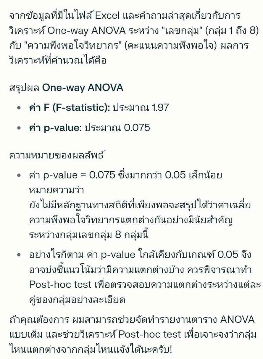 SPSS Data Editor Menu, File, Read Text Data ..., All Files (*.*) score52_grp_semp.csv Next, Delimited = checked, Variable names = checked, Next Next, Comma = checked, Next, Next, Finish Menu, File, Save as .. , score52_grp_semp.sav Menu, Analyze, Compare Means, One-Way ANOVA ..., - Dependent List = semp (ความพึงพอใจต่อเจ้าหน้าที่) - Factor = grp (เลขที่กลุ่ม) - Option, Descriptive = checked จะได้ตารางข้อมูลสรุป เช่น count, max, min OK --- Sig. = .000 F-Statistic = 25.995 --- GET DATA /TYPE=TXT /FILE='D:\thaiall.com\looker\score52_grp_semp.csv' /DELCASE=LINE /DELIMITERS="," /ARRANGEMENT=DELIMITED /FIRSTCASE=2 /IMPORTCASE=ALL /VARIABLES= sid F5.0 grp F1.0 sex A1 semp F1.0. CACHE. EXECUTE. DATASET NAME DataSet1 WINDOW=FRONT. SAVE OUTFILE='C:\score52_grp_semp.sav' /COMPRESSED.